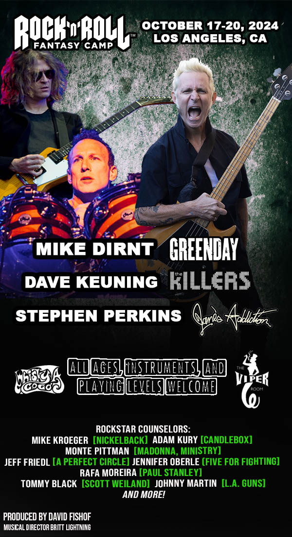 Get ready to experience the dream of a lifetime at Rock 'n' Roll Fantasy Camp this October 17-20, 2024 in Los Angeles, CA with Mike Dirnt of Green Day, Dave Keuning of The Killers, and Stephen Perkins of Jane’s Addiction!
